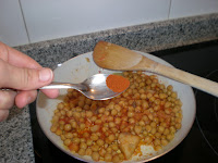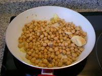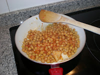 - obviamente, haber preparado cocido con anterioridad y que haya sobrado. Yo lo preparo solo con los garbanzos -no el cocido, claro está, si no la ropa vieja-, pero se puede añadir también la carne, la patata, el choricito (lo cierto es que no nos sobró nada de chorizo; incluso nos peleamos los cuatro el domingo por llevarnos un trozo más a nuestro plato). Por tanto, el ingrediente principal son los garbanzos del cocido.
